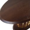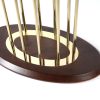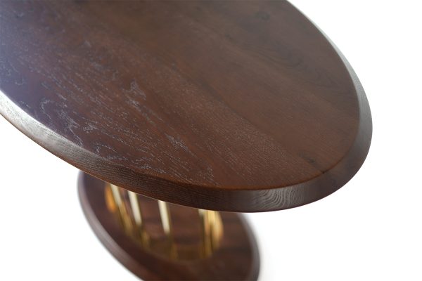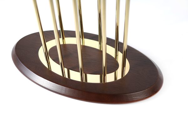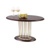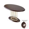 Особливу увагу привертає витончена опора — вертикальні металеві стрижні у золотому кольорі, які утворюють ефектну геометричну композицію. Вона надає столу легкості, водночас зберігаючи його стабільність та міцність. Нижня овальна основа підтримує баланс конструкції та доповнює загальний стиль.