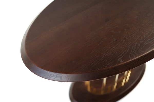 Особливу увагу привертає витончена опора — вертикальні металеві стрижні у золотому кольорі, які утворюють ефектну геометричну композицію. Вона надає столу легкості, водночас зберігаючи його стабільність та міцність. Нижня овальна основа підтримує баланс конструкції та доповнює загальний стиль.