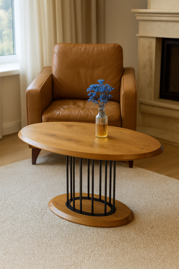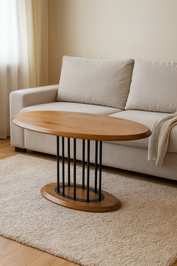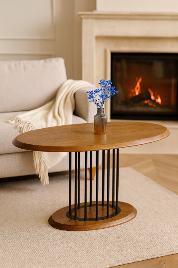 Опора виконана у вигляді вертикальних металевих прутів, що з’єднують верхню і нижню дерев’яну основу. Така конструкція не лише забезпечує стабільність, а й створює стильний візуальний акцент. Металевий каркас покритий матовою порошковою фарбою, стійкою до подряпин і корозії.