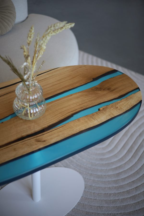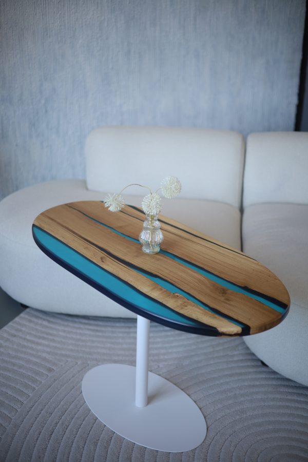 Стіл встановлений на мінімалістичній білої металевій основі, що підкреслює його легкість і сучасний вигляд. “Еліпс, блакитний острів №1” стане ідеальним доповненням для будь-якої сучасної вітальні або робочого простору, привносячи нотки природної краси та елегантного дизайну.