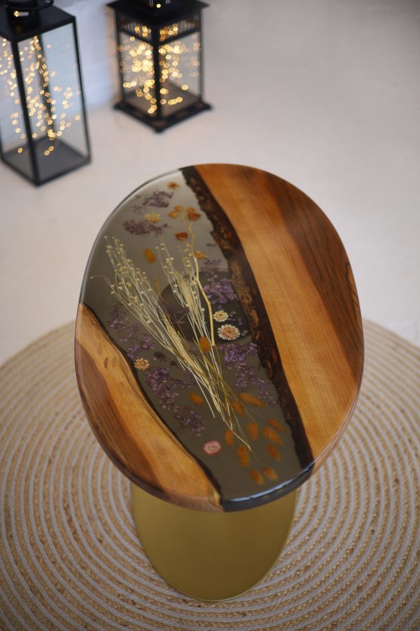 Журнальний стіл “Еліпс, квіти №2” — це справжній витвір природи, що поєднує в собі красу дерева та чарівність квітів. Столешниця виготовлена з високоякісного дерева, а в її центрі — композиція з висушених квітів, залитих епоксидною смолою. Ніжні фіолетові, жовті та білі відтінки рослин створюють ефект живого поля, вмонтованого прямо в поверхню, додаючи виробу неповторної виразності.
