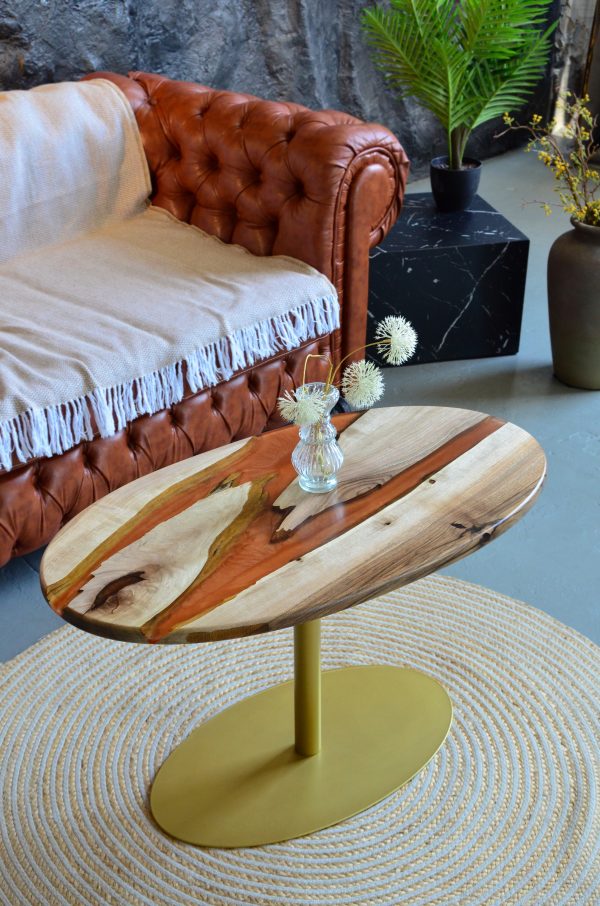 Журнальний стіл “Еліпс, теракотовий острів” — це поєднання природної краси та сучасного дизайну, яке одразу привертає увагу. Столешниця виготовлена з масиву дерева, а її характерною особливістю є вкраплення теракотової епоксидної смоли, що нагадує потік лави або теплу землю пустелі.