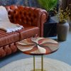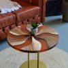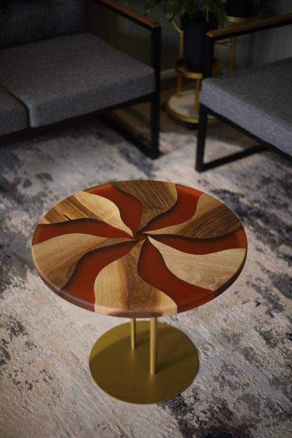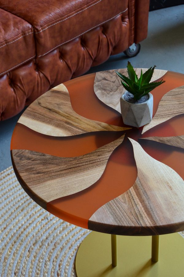 Журнальний стіл “Коло, теракотовий №1” — це витончене поєднання натурального дерева та епоксидної смоли. Стільниця у вигляді ідеального кола оздоблена унікальним художнім візерунком, що нагадує стилізовану квітку або хвилю, створену з чергування дерев’яних вставок і теракотових сегментів.