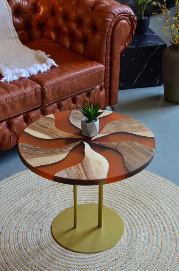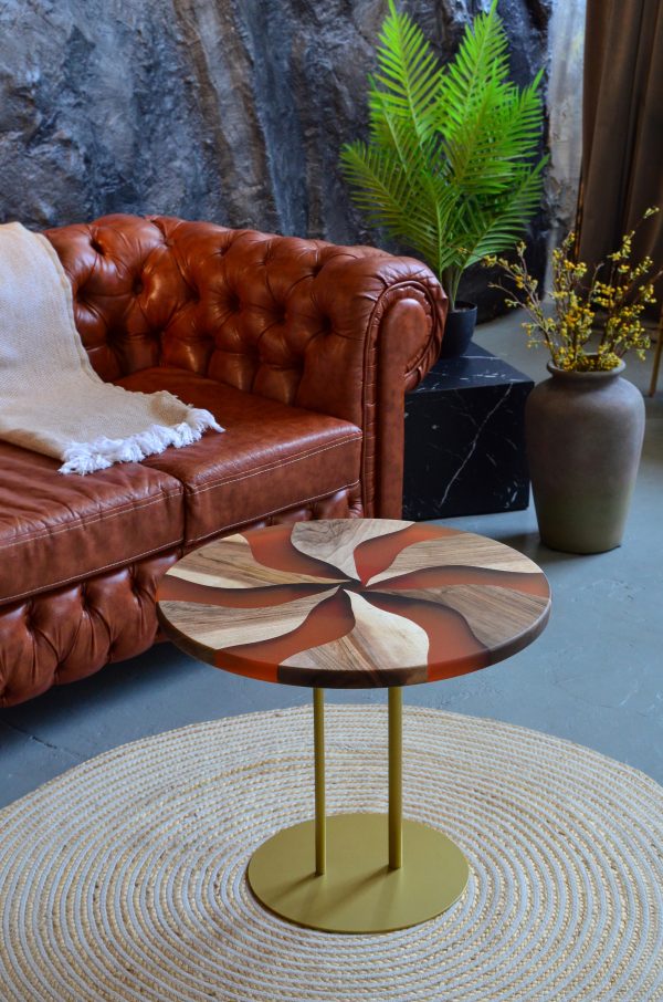Журнальний стіл “Коло, теракотовий №1” — це витончене поєднання натурального дерева та епоксидної смоли. Стільниця у вигляді ідеального кола оздоблена унікальним художнім візерунком, що нагадує стилізовану квітку або хвилю, створену з чергування дерев’яних вставок і теракотових сегментів.
