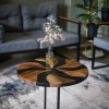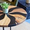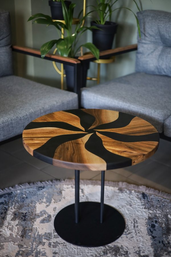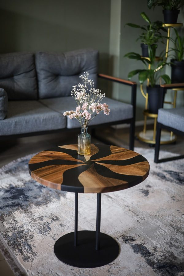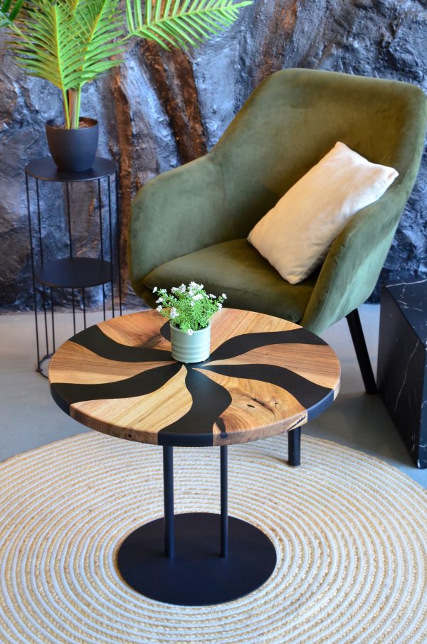 Журнальний стіл “Коло, чорний №1” – це стильний та сучасний меблевий виріб, який ідеально пасує для вітальні чи зони відпочинку. Стільниця виготовлена з натурального дерева з унікальним дизайном у вигляді чорних хвилеподібних смуг, що створюють динамічний і водночас елегантний вигляд. Основа столу виконана з міцного чорного металу у формі кола, що забезпечує надійність та стійкість. Такий стіл стане яскравим акцентом у будь-якому інтер’єрі, поєднуючи функціональність і художню привабливість.
