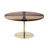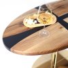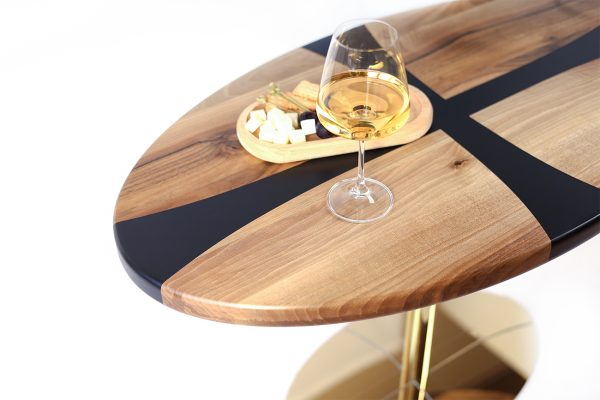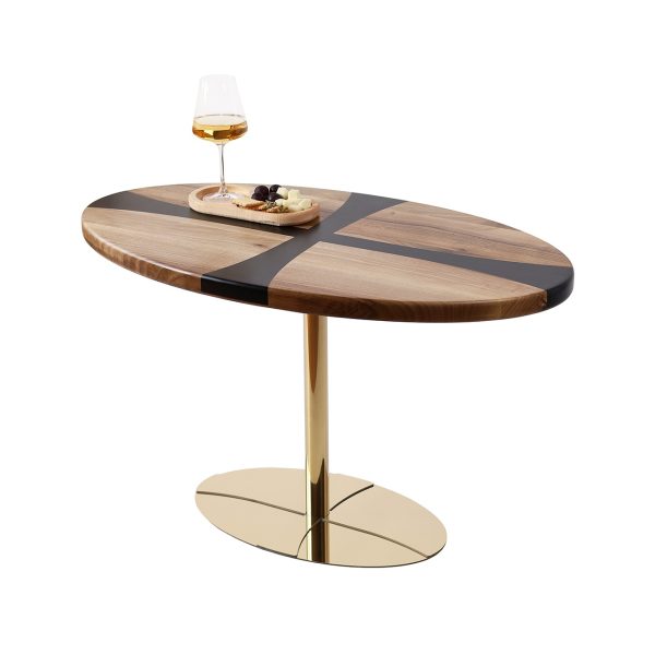 Окрему увагу привертає елегантний золотий металевий каркас. Його ніжна лінія створює привабливий контраст із темною деревиною, надаючи столу витонченості та розкоші. Каркас у вигляді стійкої вертикальної опори й овальної основи забезпечує не тільки стабільність, але й чудову візуальну гармонію.