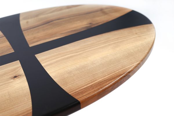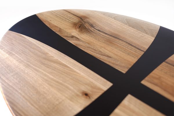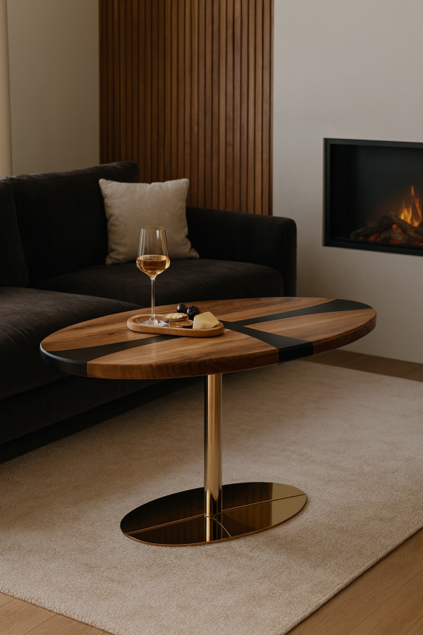 Журнальний стіл “Онікс” — це стильний витвір, який поєднує в собі природну красу дерева та розкіш металу. Стільниця з високоякісного горіха з виразною текстурою деревини надає виробу елегантний вигляд і підкреслює тепло натуральних матеріалів. Овальна форма стільниці та чорні акценти на її поверхні додають сучасної естетики та візуальної легкості.