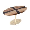 Окрему увагу привертає елегантний золотий металевий каркас. Його ніжна лінія створює привабливий контраст із темною деревиною, надаючи столу витонченості та розкоші. Каркас у вигляді стійкої вертикальної опори й овальної основи забезпечує не тільки стабільність, але й чудову візуальну гармонію.