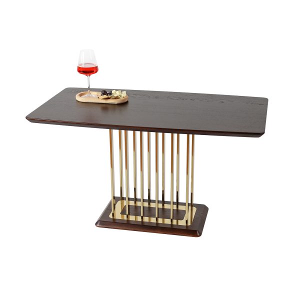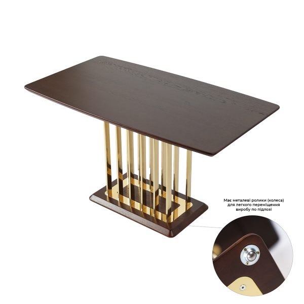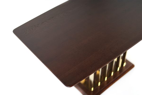 Журнальний стіл “Тор” — це вдале поєднання розкоші та стриманої елегантності. Стільниця з натурального дуба в глибокому коричневому відтінку виглядає тепло та вишукано, а глянцевий золотий каркас із вертикальних прутів додає легкості й благородного блиску.
