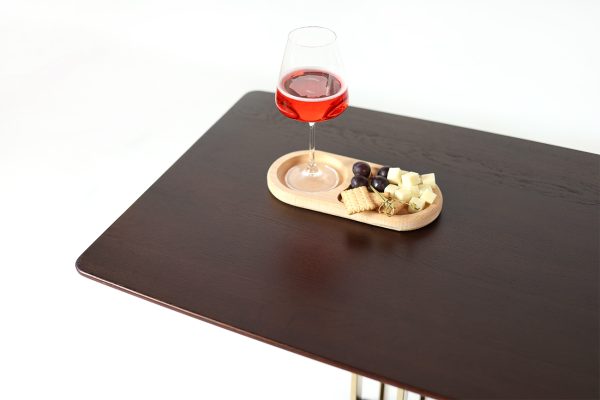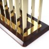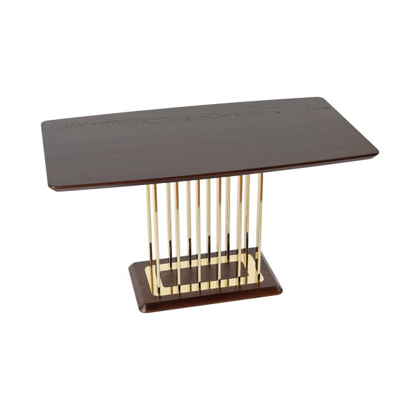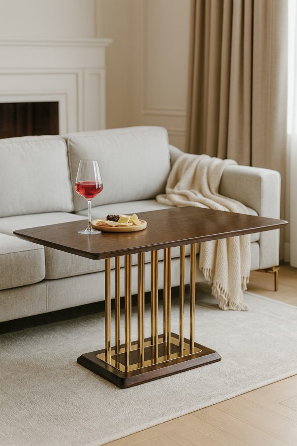 Журнальний стіл “Тор” — це вдале поєднання розкоші та стриманої елегантності. Стільниця з натурального дуба в глибокому коричневому відтінку виглядає тепло та вишукано, а глянцевий золотий каркас із вертикальних прутів додає легкості й благородного блиску.