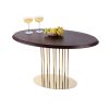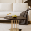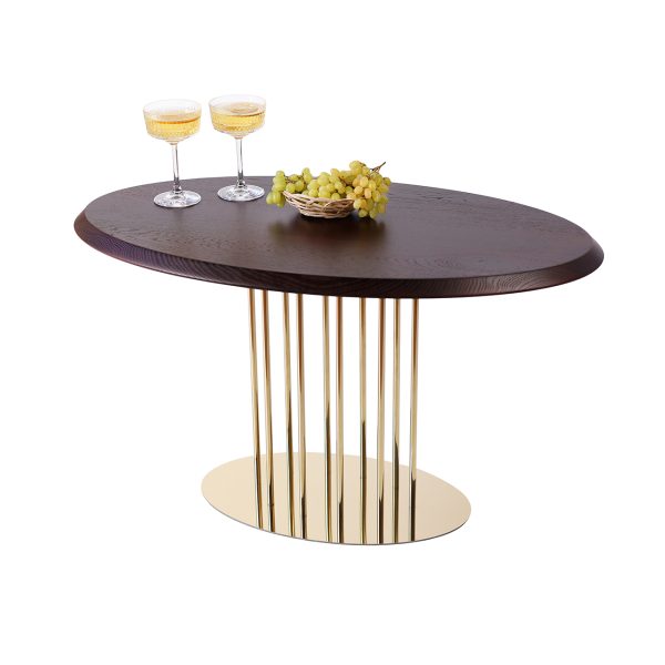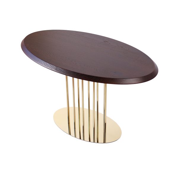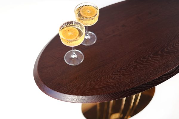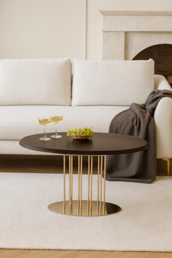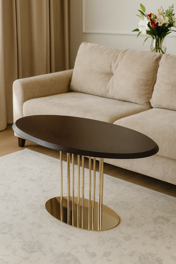 Журнальний стіл “Турмалін” в кольорі “Горіх Амарена” – стильний і елегантний акцент для вашого інтер’єру. Має прямокутну форму з витонченими золотими ніжками, що додають розкоші та легкості. Розміри столу: 900×550 мм. Поверхня з натурального дерева у темному відтінку, що підкреслює його вишуканість. Золотий каркас з тонкими металевими стійками створює відчуття легкості та модерну.