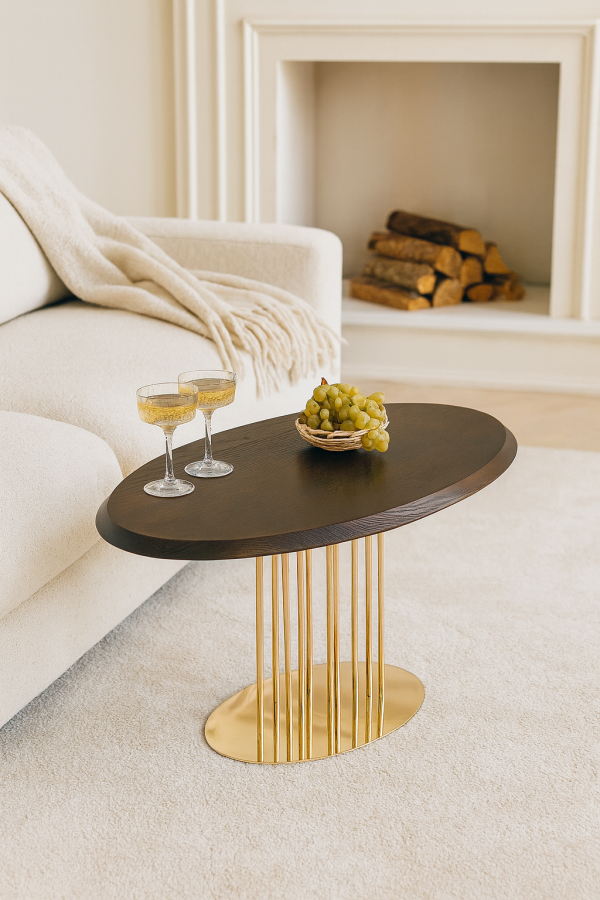 Журнальний стіл “Турмалін” в кольорі “Горіх Амарена” – стильний і елегантний акцент для вашого інтер’єру. Має прямокутну форму з витонченими золотими ніжками, що додають розкоші та легкості. Розміри столу: 900×550 мм. Поверхня з натурального дерева у темному відтінку, що підкреслює його вишуканість. Золотий каркас з тонкими металевими стійками створює відчуття легкості та модерну.